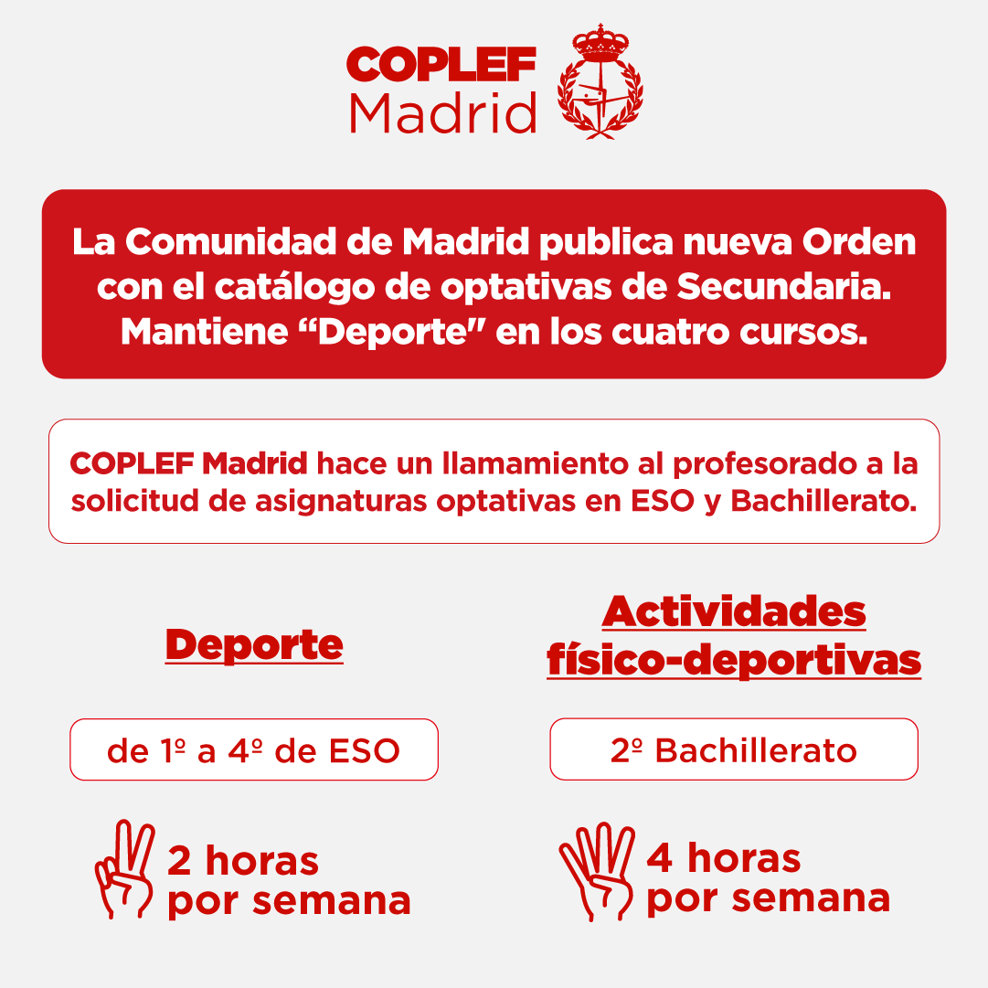 Desde COPLEF Madrid hacemos un llamamiento al uso correcto de la denominación de las profesiones bajo Ley 6/2016, y NO confundir a la población con NOMENCLATURAS y DENOMINACIONES NO OFICIALES como “EDUCADOR/A FÍSICO DEPORTIVO/A”, que pueden inducir al error y generar confusión entre personas con titulación en CIENCIAS DE LA ACTIVIDAD FÍSICA Y DEL DEPORTE, así como entre la población en general. |