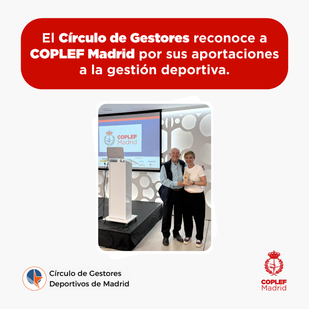 En el marco de esta celebración, se otorgó un especial reconocimiento a COPLEF Madrid que recogió la presidenta Dña. Rosa de Tapia (Col. 12828), por su destacada labor y sus aportaciones fundamentales al desarrollo de la gestión deportiva regional. Este galardón pone en valor el compromiso de COPLEF Madrid con la profesionalización y defensa de la ordenación profesional en la CAM, así como su colaboración constante a la hora de aportar profesionales que ofrecen servicios deportivos seguros y saludables a la ciudadanía, consolidando su papel como un referente esencial en los profesionales del deporte en la Comunidad de Madrid.