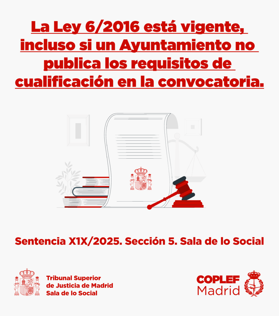 El TSJM ratifica la exclusión de un aspirante en un proceso selectivo por no presentar cualificación. La Ley 6/2016 está vigente aunque no se especifique en los requisitos de las plazas.